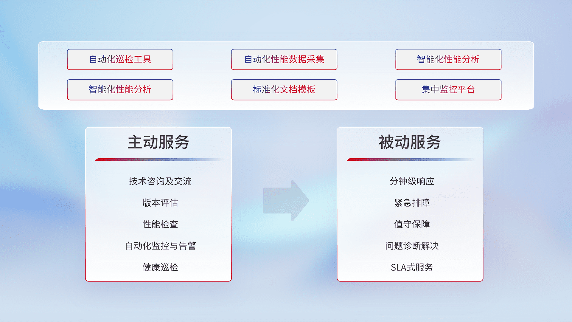 智能化工具和标准化文档,,,,保障服务质量,,提供主动服务(包含技术咨询、、、、版本评估、、性能检查、、自动化监控与告警、、健康巡检)和被动服务包含(分钟级响应、、、紧急排障、、、、值守保障、、、问题诊断解决、、SLA服务)。。。。